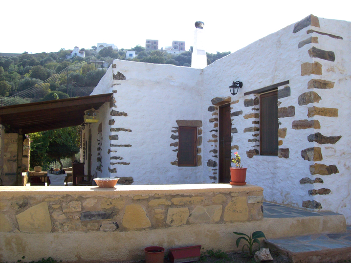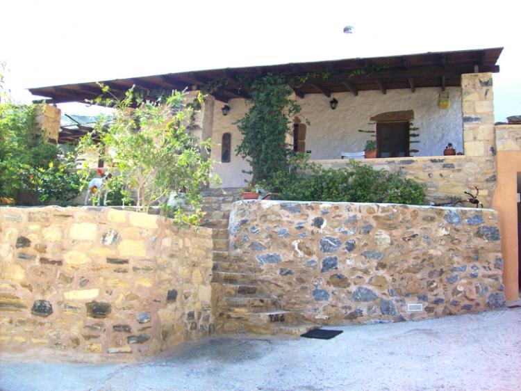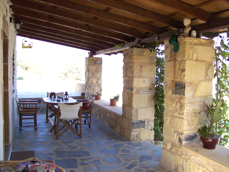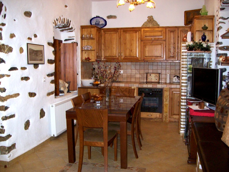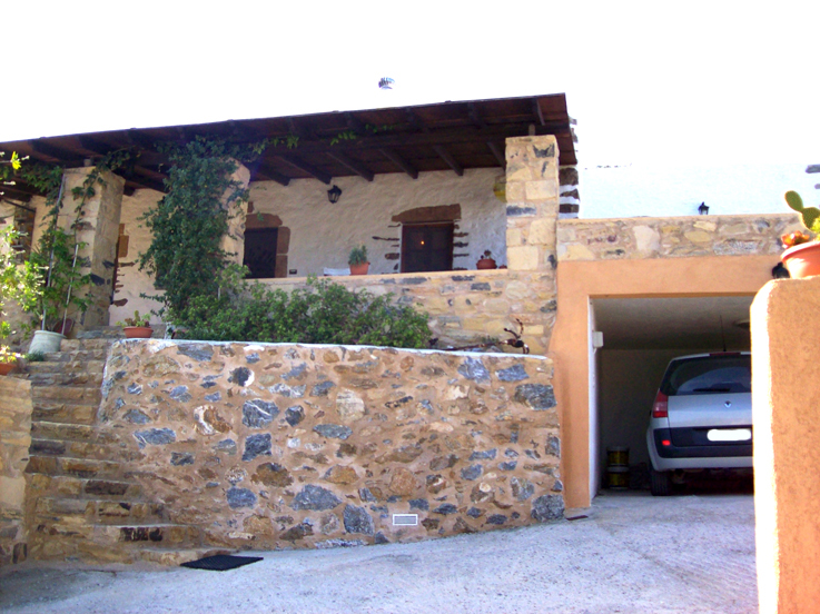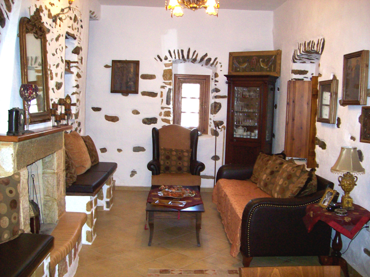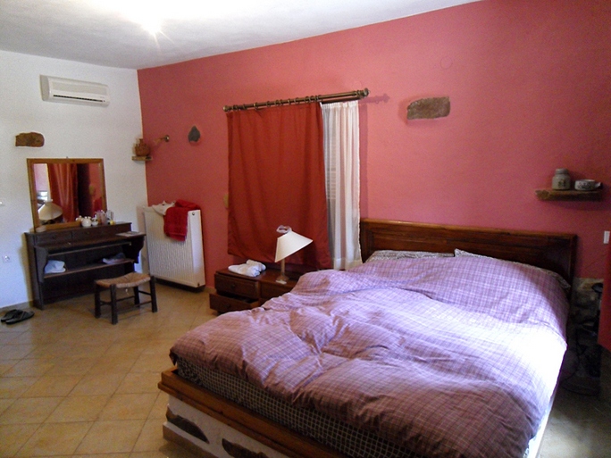 Bedrooms are spacious and are also equipped with fitted wardrobes covered with wooden cupboards. Master bedroom has a large bed traditionally built with stone. It also its own WC with douche.